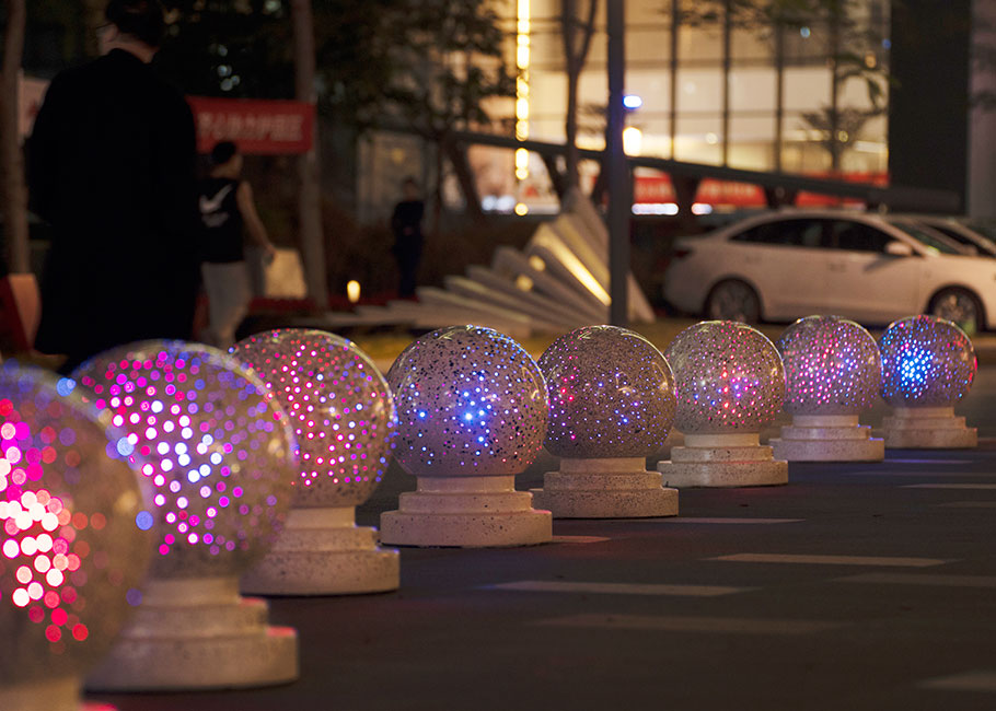 新型路障石材具有擋車功能,提升場所的形象和安全性,夜晚展現出特別絢麗的效果